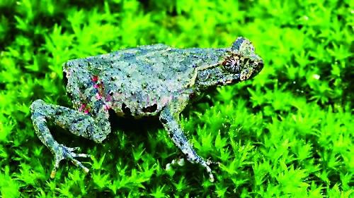 都庞岭角蟾主要分布于湖南省永州市都庞岭地区,栖息在低海拔山区溪沟附近的湿润环境中,常见于溪沟边的石缝、落叶堆或灌丛深处。这里水质清澈、流速适中,周围植被覆盖良好,为都庞岭角蟾提供了理想的隐蔽与繁殖环境。