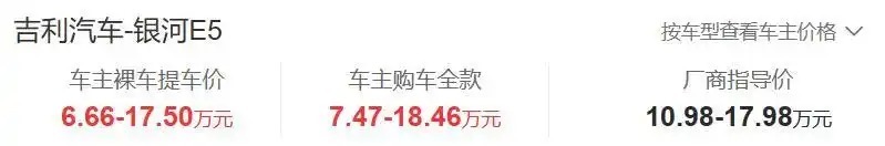 银河E5售价10.98-17.98万元,车主提车价为6.66万元起,优惠了4万多,当然,想要拿到这样的优惠你得有一台旧车,这样才能拿到报废补贴或置换补贴。